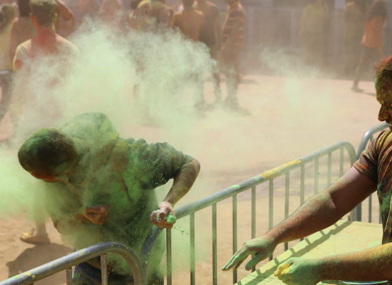 Hindu "Festival of Colors" celebrated around March to welcome spring, mark the triumph of good over evil, and honor the love of Radha and Krishna. It features a day of fun, chaotic play with colored powders (as seen in the photos here).
