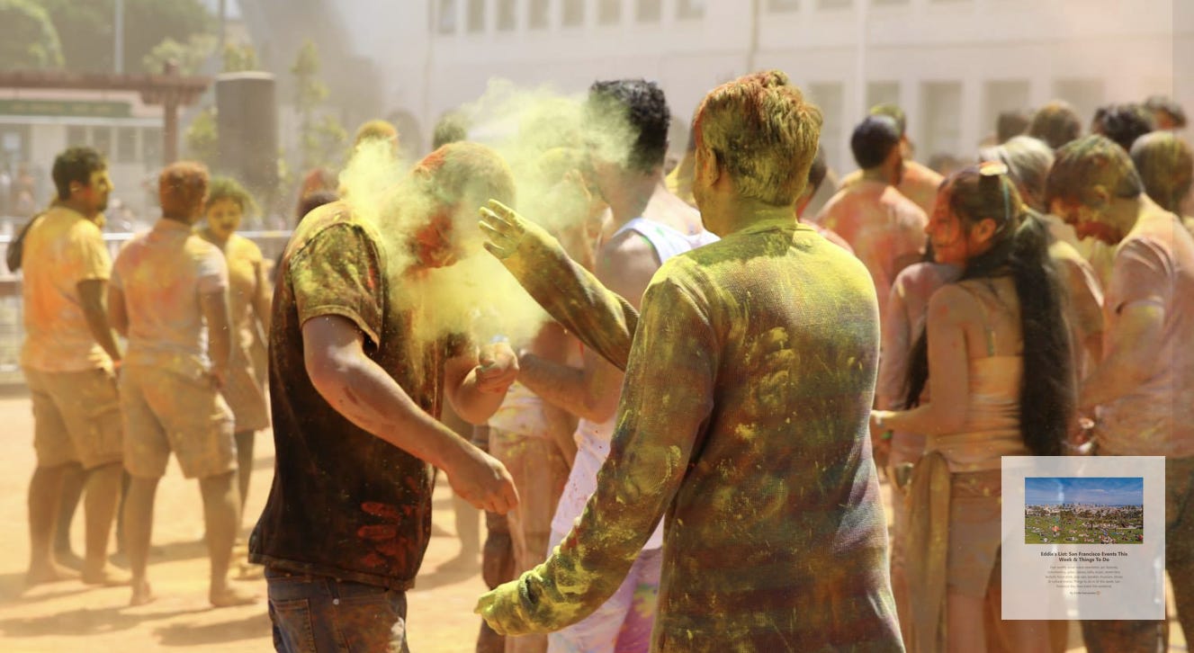 A few of the Holi/Festival of Colors events below may appear in the free weekly newsletter, but not all of them will. Sign up below for the free email newsletter with events, things to do each week (1 email per week, no AI, manually curated, usually sent on Mondays). Over 26,000 subscribers and counting.