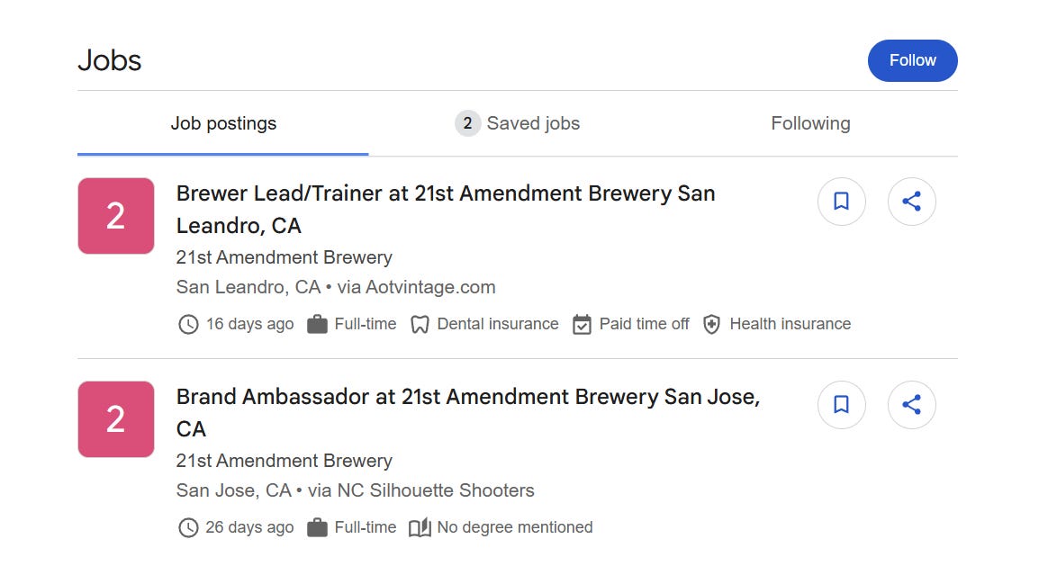 In more news, there are job posts attributed to 21st Amendment seeking a brewer lead and brand ambassor positions. There were no jobs found on their own website but as often the case, this may not mean much as some businesses are slow to update their own websites, use 3rd parties, lack necessary web developers etc. to coordinate efforts across the business.