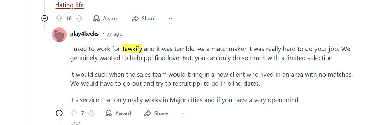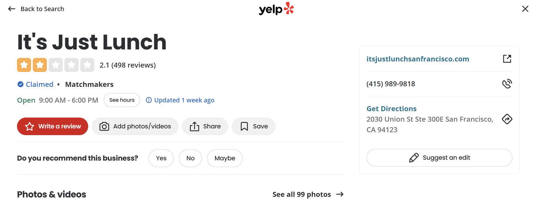 For matchmaking companies with multiple locations (corporate-owned, franchises), if you are unable to find local reviews, look up reviews for other cities i.e. ‘matchmaking company los angeles yelp’ or ‘matchmaking service nyc reddit’ or even ‘matchmaking company lawsuit’.