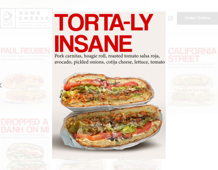 This week’s recommendation is the Torta-ly Insane sandwich from Ham & Cheese in the Richmond District. The sandwich features hoagie, pulled pork carnitas, spicy tomato salsa roja, black bean puree, avocado, pickled onions, crema, lettuce & tomato.