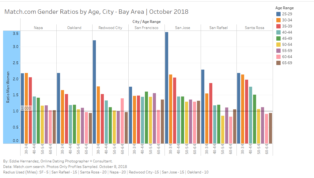 A while back, I went through the data on Match.com to analyze gender ratios across several regions in the Bay Area. As you might expect, the peninsula was one of the worst for young men.